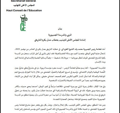 وأشاد المجلس بما ورد في خطاب رئيس الجمهورية محمد ولد الشيخ الغزواني بمدينة عدل بكرو، واصفًا إياه بـ “الخطاب المفصلي في مسار ترسيخ مفهوم الدولة الحديثة التي تجعل من التعليم قاعدة للأمن الفكري والنهضة الوطنية”.