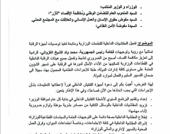 وشدد ولد اجاي على أن يتم إعداد تقرير بعد كل مهمة تفتيش، وإحالة نسخة منه إلى المفتشية العامة للدولة ومحكمة الحسابات والمفتشية العامة للمالية. كما دعا لعقد اجتماعات ربع سنوية لمتابعة الرقابة الداخلية وضمان التنفيذ المنتظم لتوصيات أجهزة الرقابة.