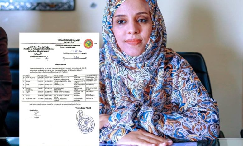 وبحسب المذكرة الرسمية الموقعة من طرف الأمين العام للوزارة، يحيى باب الطالب، فقد تم تعيين محمد سالم محمد المصطفى مديراً للتربية في ولاية الحوض الغربي، ومحمدن مختار باب حمدي مديراً في ولاية كوركل، بينما تولى اتيام عاليون إدارة التربية في ولاية آدرار.