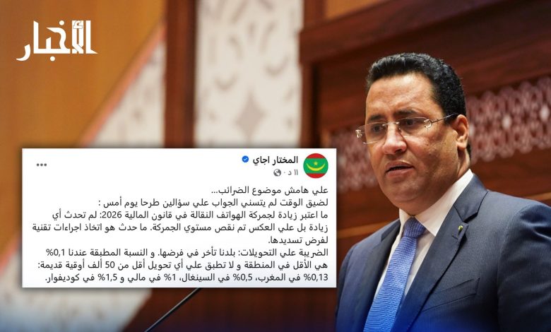 أكد الوزير الأول المختار ولد اجاي أنه لا صحة لما يتم تداوله حول رفع الرسوم الجمركية على الهواتف النقالة في قانون المالية لسنة 2026، موضحاً أن الحكومة اتخذت تدابير تقنية لضمان تحصيل الجمركة فقط دون زيادة في قيمتها.