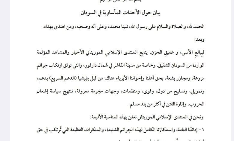 المنتدى الإسلامي الموريتاني يدعو لنصرة الشعب السوداني ويدين الجرائم المرتكبة بحقه